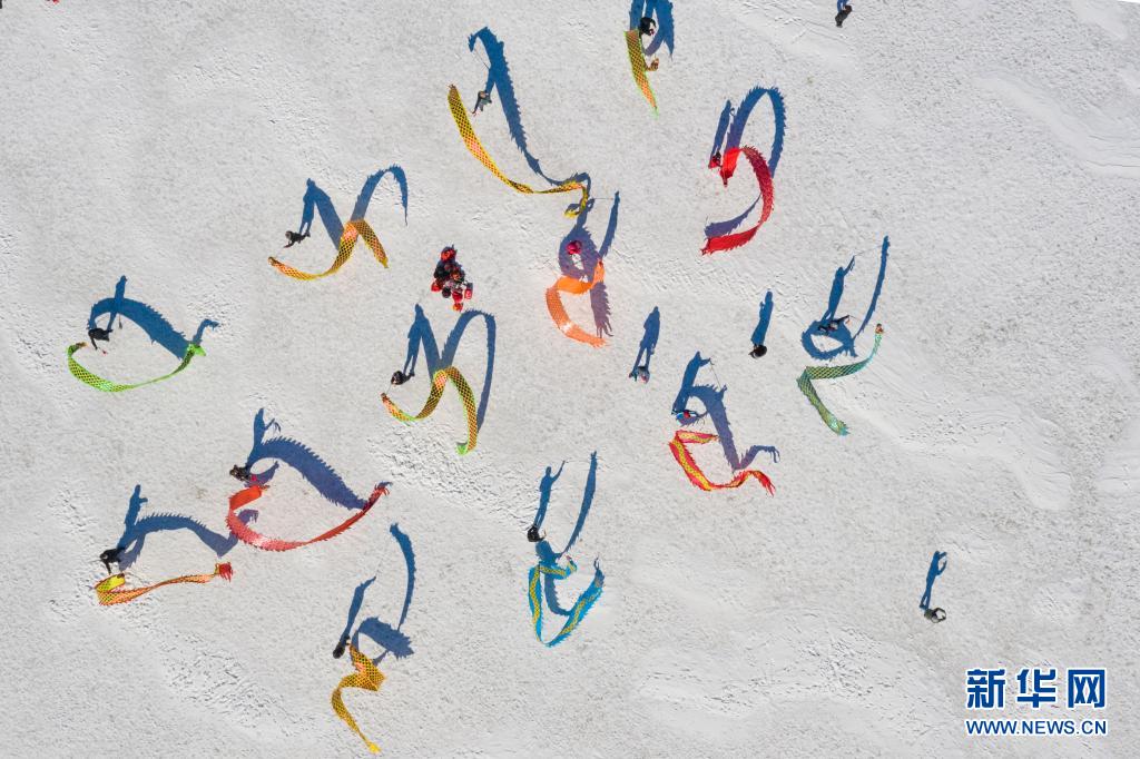 健身爱好者在鹤岗市新一体育公园舞彩带龙(3月6日摄,无人机照片)。