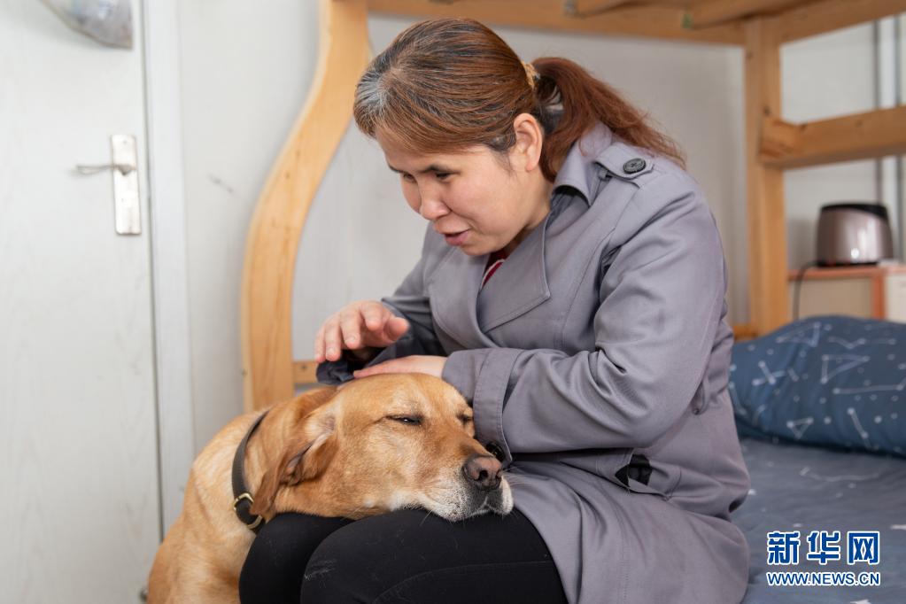导盲犬“多多”把头放在祝爱叶腿上,祝爱叶一边抚摸着它的头一边和它说话(4月26日摄)。