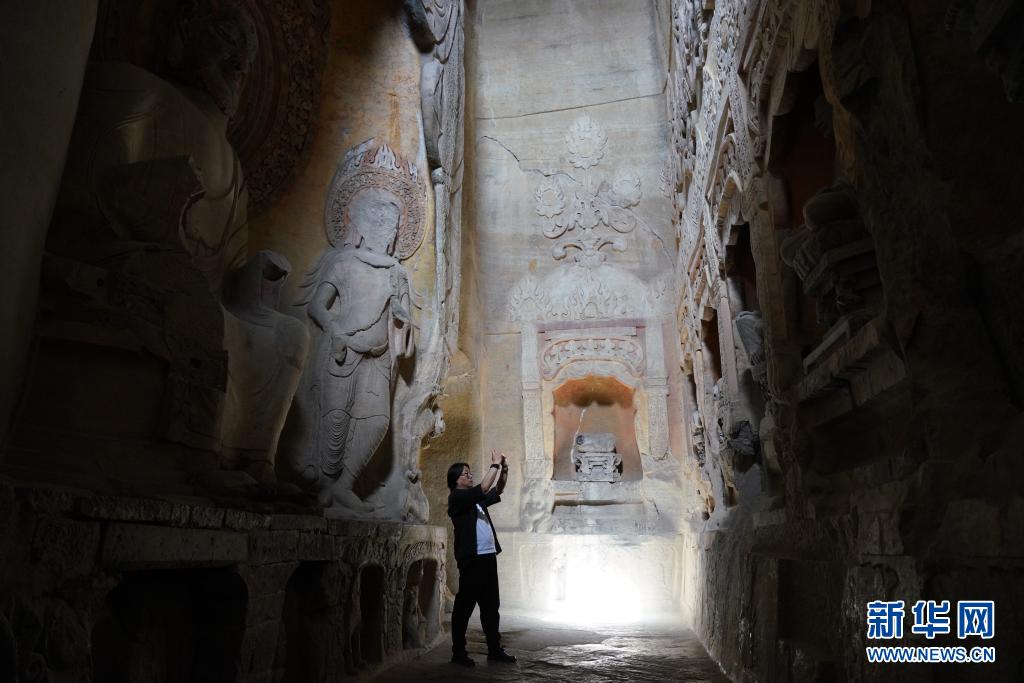 4月29日,赵立春在北响堂山石窟内拍摄佛教造像。