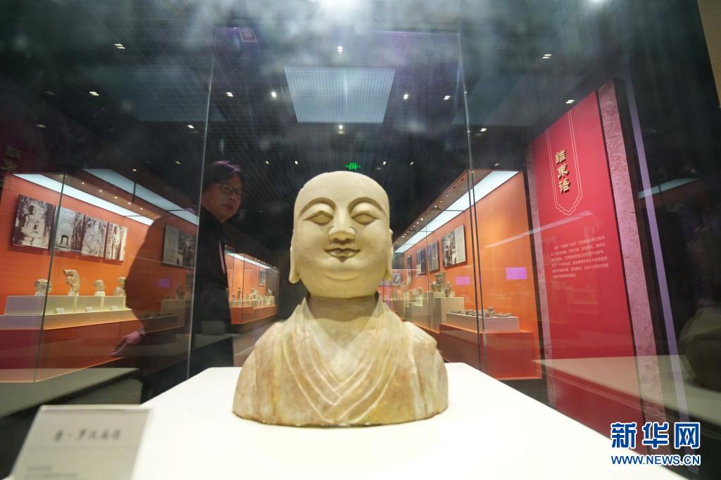 4月30日,赵立春在响堂山石窟艺术博物馆内查看展出的佛教造像。