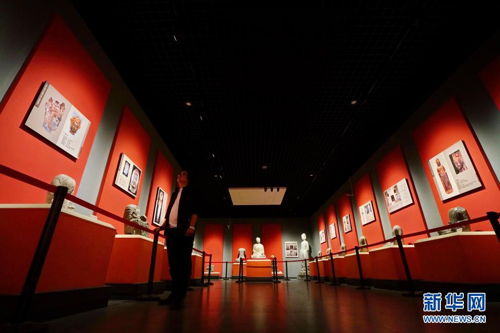 4月30日,赵立春在响堂山石窟艺术博物馆内查看展出的佛教造像。