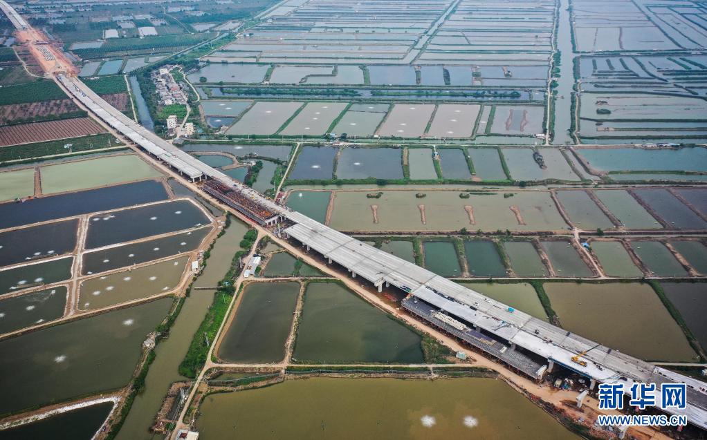 5月1日拍摄的珠海鹤港高速公路二期工程高栏港枢纽立交桥建设现场(无人机照片)。