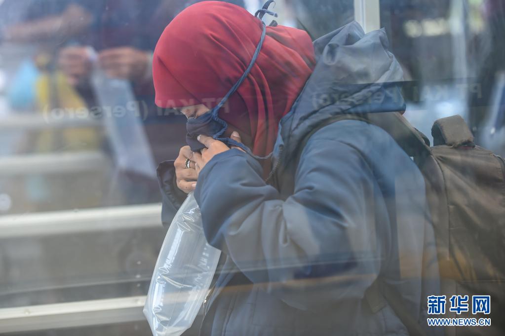 5月1日,在印度尼西亚雅加达,一名旅客乘火车返乡前向一个塑料袋中吹气以检测新冠病毒。
