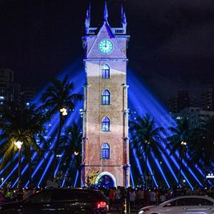 5月1日晚,海口钟楼上演光影秀,给劳动节假期的椰城增添了喜庆气氛。