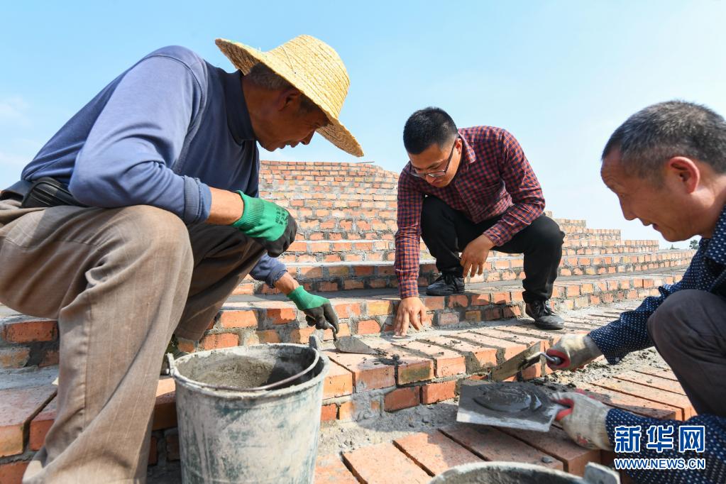4月30日,在四川省彭山区公义镇新桥村,刘沈厅叮嘱工人修建新种植基地的观景台步梯。