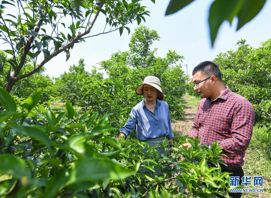 4月30日,在四川省彭山区公义镇,刘沈厅(右)到家庭农场主郑利彬的果园查看交流晚熟柑橘的长势情况。