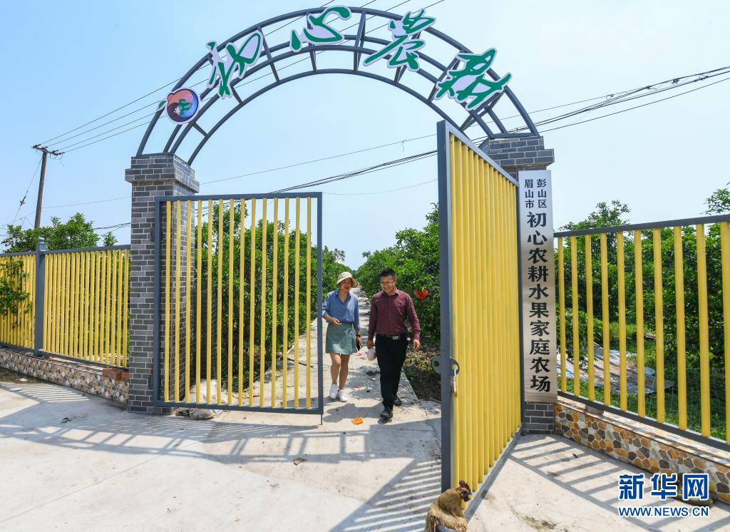4月30日,在四川省彭山区公义镇,刘沈厅(右)和家庭农场主郑利彬走出农场大门。
