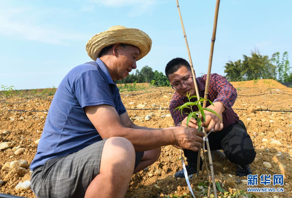 4月30日,在四川省彭山区公义镇新桥村,刘沈厅叮嘱工人给黄桃绑枝的注意事项。