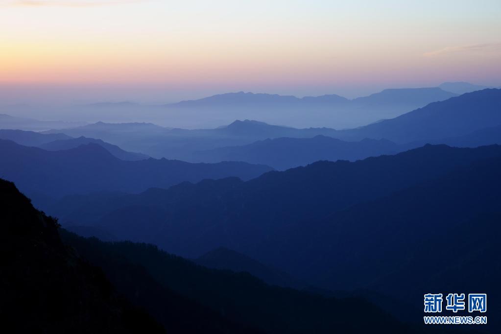 在牛背山山顶,往东眺望晨曦中的远山(5月2日摄)。