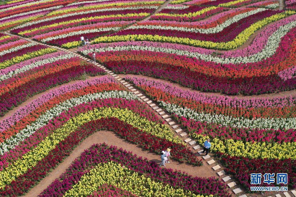 5月2日,游人在湖北省荆门市圣境花谷游玩(无人机照片)。