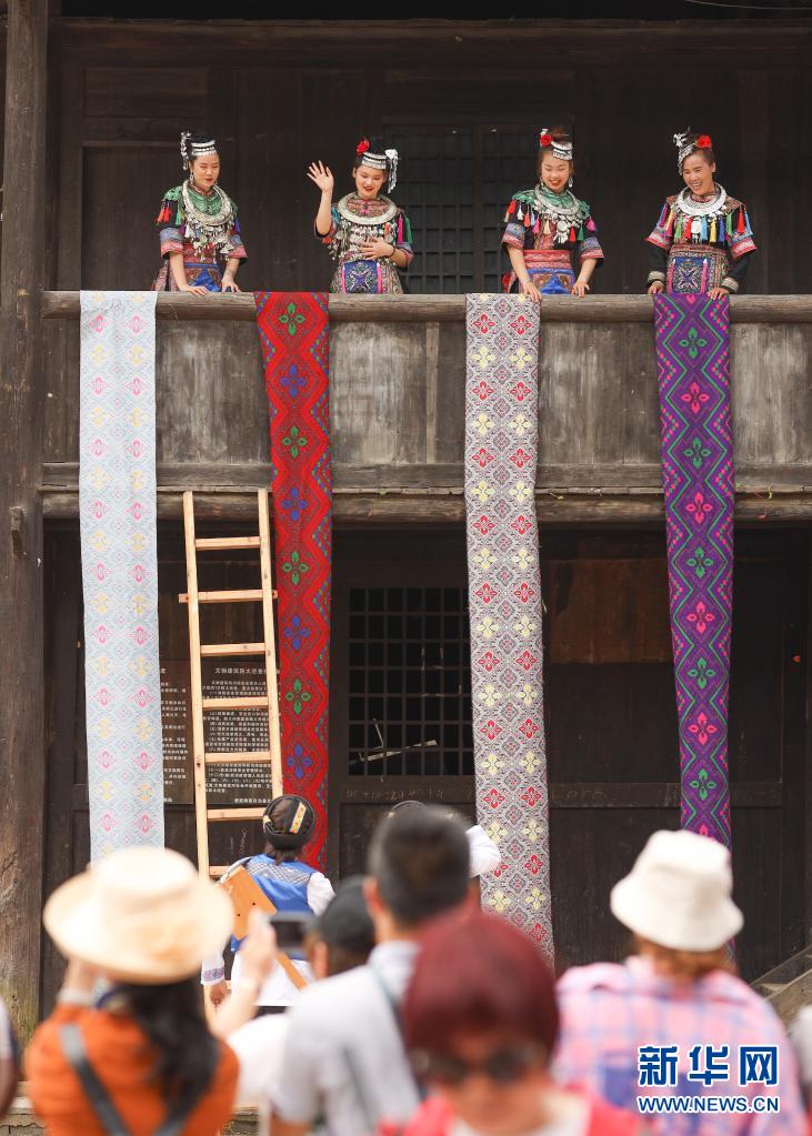 5月2日,游客在湖南省通道侗族自治县双江镇芋头古寨观赏侗锦。