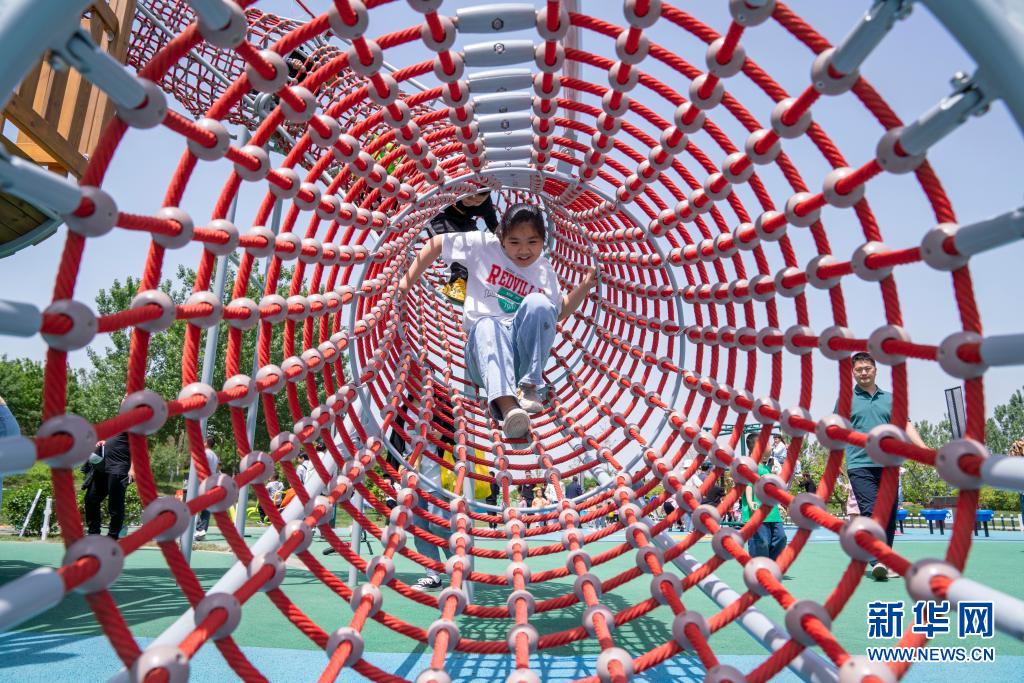 5月1日,小朋友在山西省运城市禹都公园体育健身场地游玩。