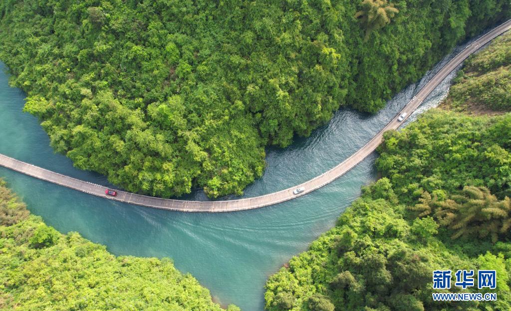 5月2日,游客在湖北省恩施土家族苗族自治州宣恩县狮子关景区水上栈道驾车游玩(无人机照片)。