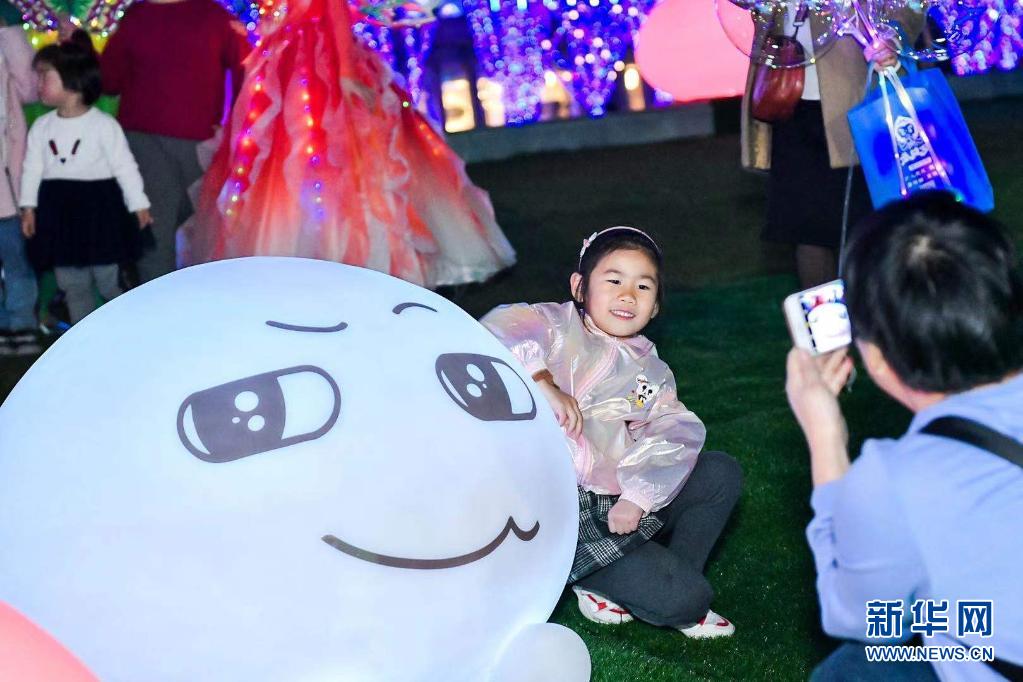 5月2日,小朋友和家长在一个灯光作品前拍照。