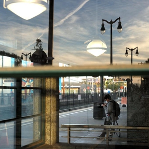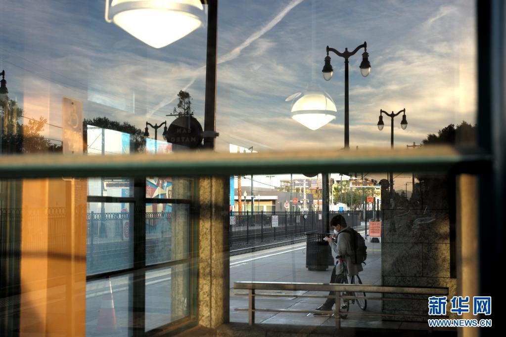 这张拍摄于4月29日的照片显示,在美国加利福尼亚州北部城市圣马特奥火车站,一名男子戴着口罩在站台上等待列车。