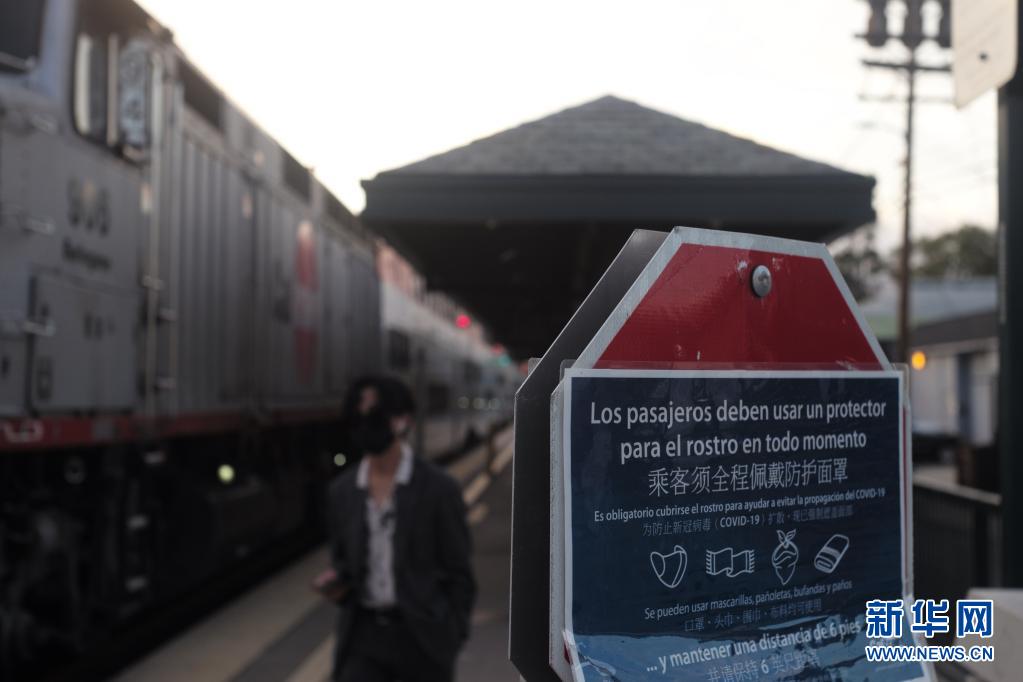 这张拍摄于4月23日的照片显示,在美国加利福尼亚州北部城市圣马特奥火车站,下车的乘客戴着口罩在站台上行走。