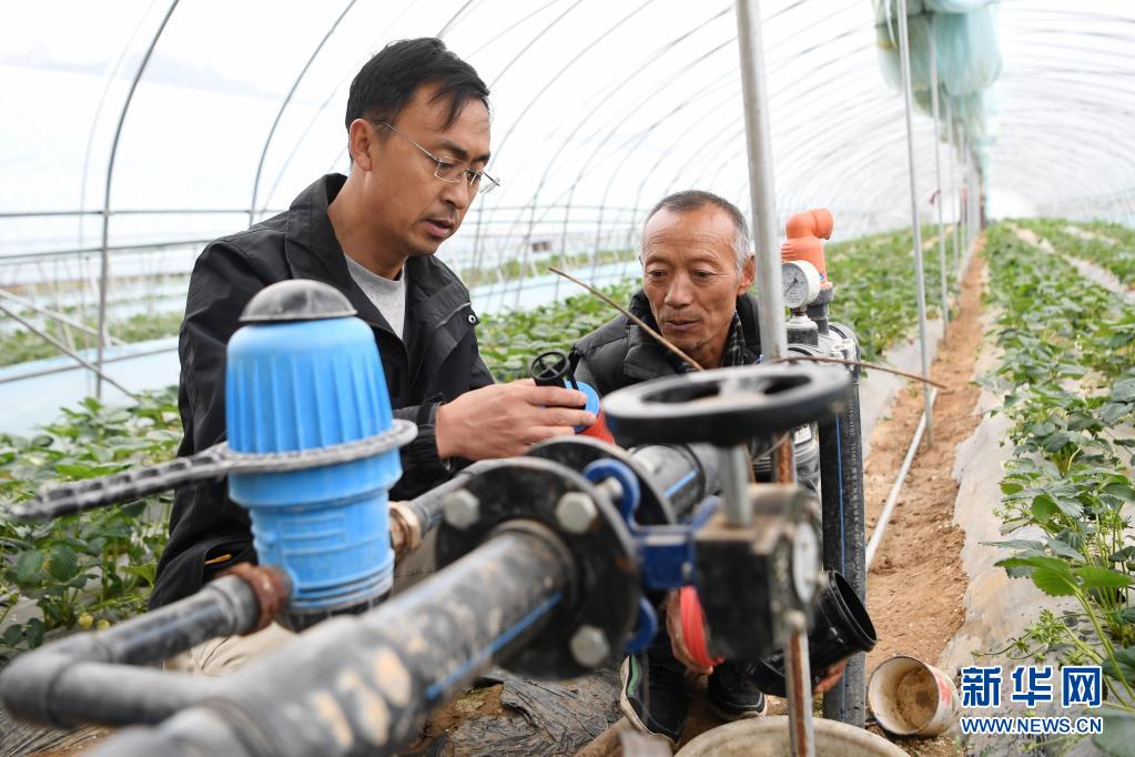 张书豪(左)向村民了解草莓大棚的给水施肥情况(4月27日摄)。