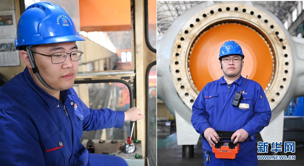 哈电集团哈尔滨电机厂有限责任公司“80后”吊车工陈洪宝在作业中(拼版照片,4月8日摄)。