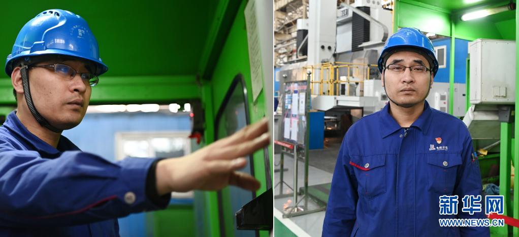 这是一张拼版照片:左图为哈电集团哈尔滨电机厂有限责任公司“80后”镗铣工马德臣在作业中(4月8日摄);右图为马德臣在车间内(4月8日摄)。
