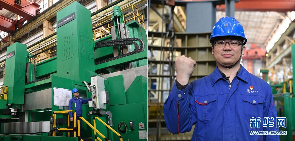 这是一张拼版照片:左图为哈电集团哈尔滨电机厂有限责任公司“80后”车工邱利在作业中(4月29日摄);右图为邱利在车间内(4月29日摄)。