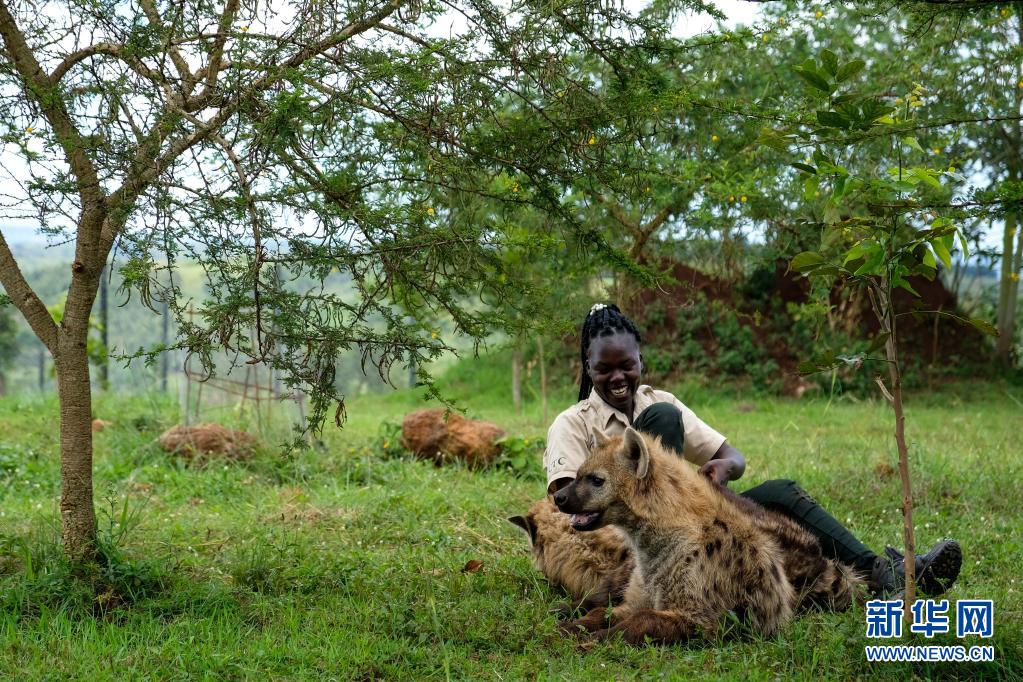 4月14日,霍莉·奥利维亚·阿凯洛在乌干达布坦巴拉区的CTC野生动物保护中心与鬣狗互动。
