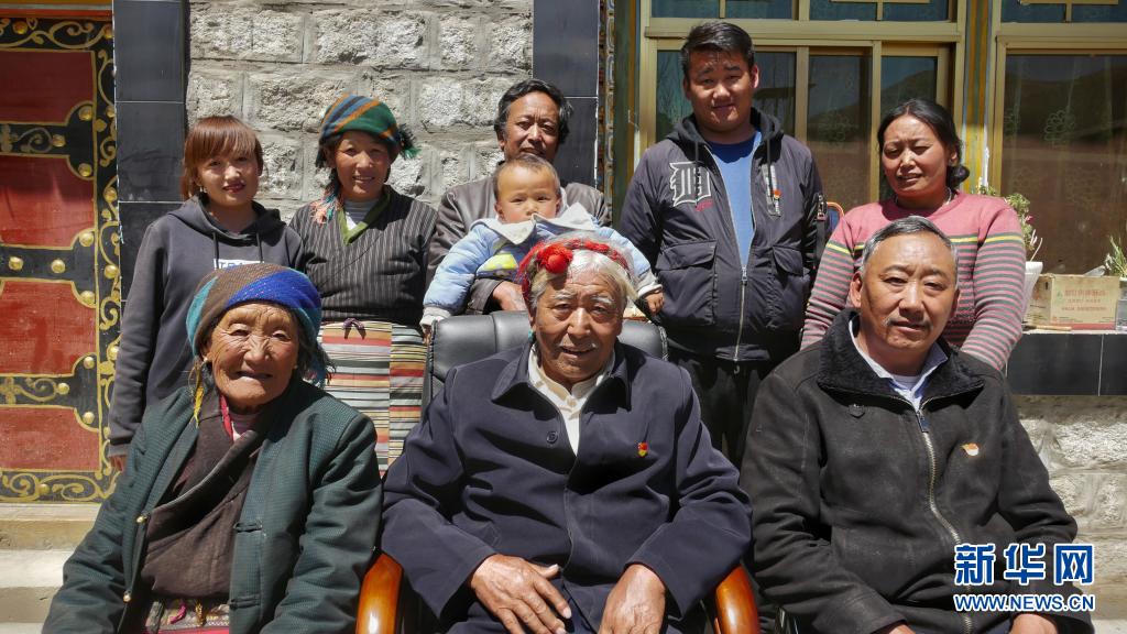 顿珠旺杰(前中)和家人的合影(4月5日摄)。新华社记者 孙阳 摄
