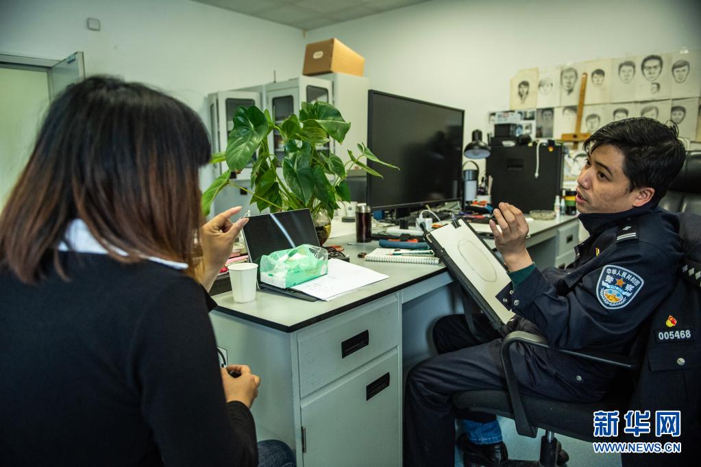 朱允宏在和当事人核对嫌疑人面部细节(5月2日摄)。新华社记者 陶亮 摄