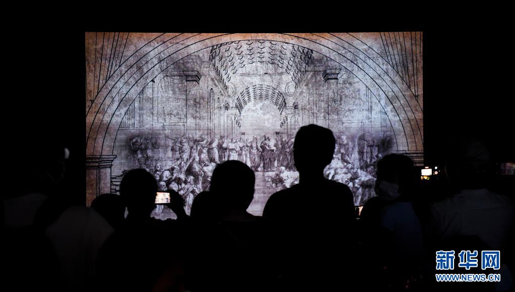 5月3日,观众在观看拉斐尔作品《雅典学院》的数字媒体解析。
