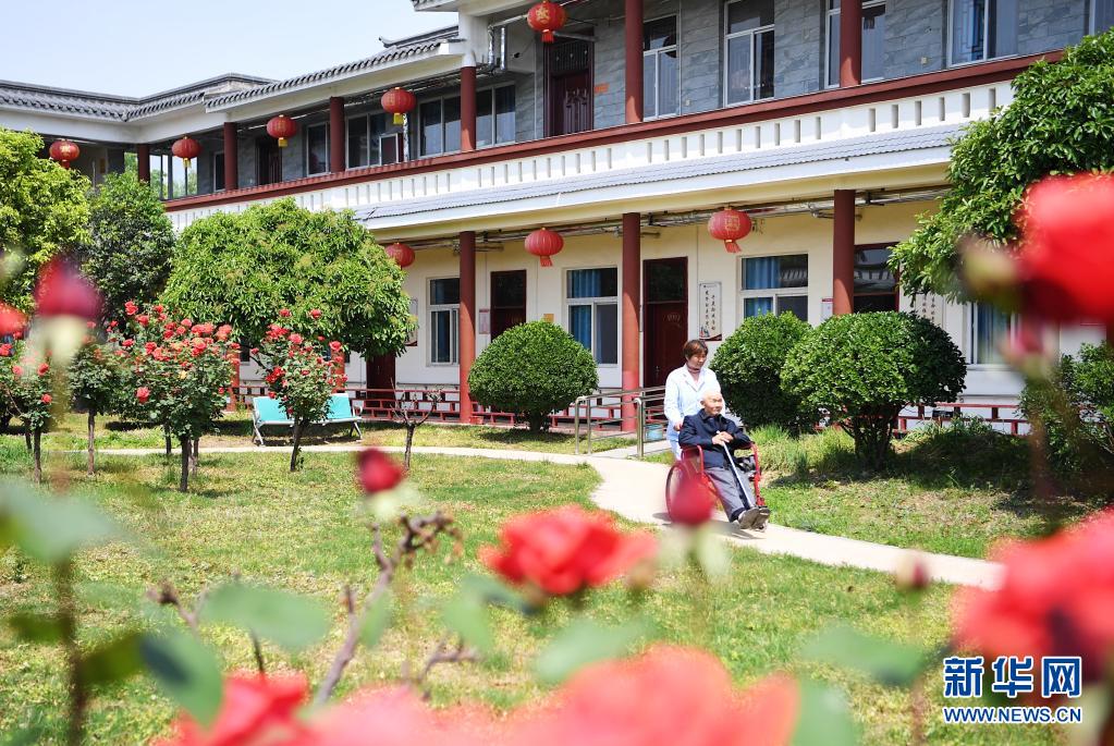 在驻马店市经济开发区重度残疾人集中托养中心,护工推着入住人员从院子里走过(5月2日摄)。
