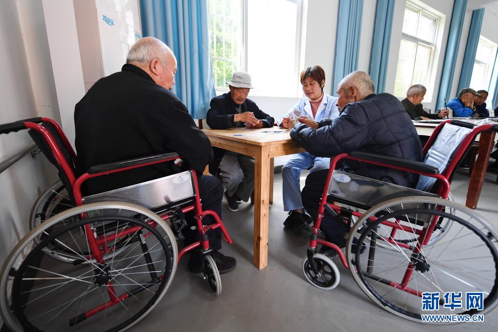 在驻马店市经济开发区重度残疾人集中托养中心文体活动室,护工陪着入住人员休闲(5月2日摄)。