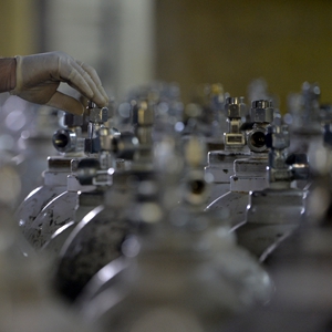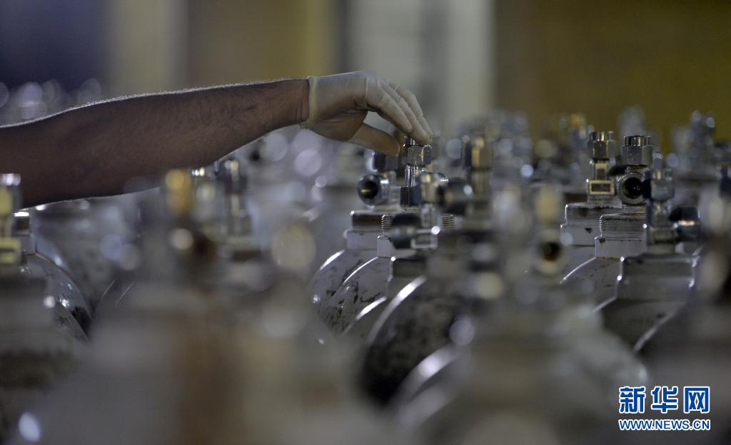 5月3日,一名工作人员在印控克什米尔地区查谟的医院中检查医用氧气罐。