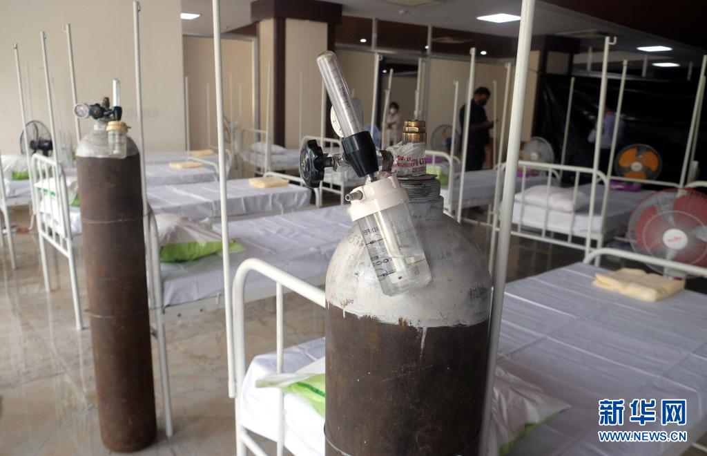这是5月3日在印度加尔各答拍摄的一处新冠临时医院床位旁的氧气瓶。