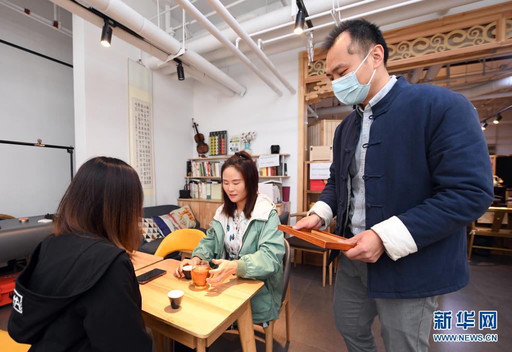 李卓澄(右一)在“小茶馆”为客人上茶(4月29日摄)。新华社记者 任超 摄