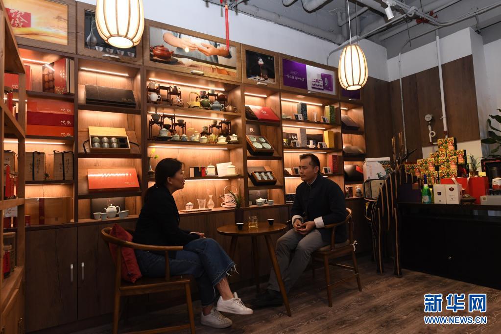 李卓澄(右)在“小茶馆”中与客人交流(4月29日摄)。新华社记者 赵婷婷 摄