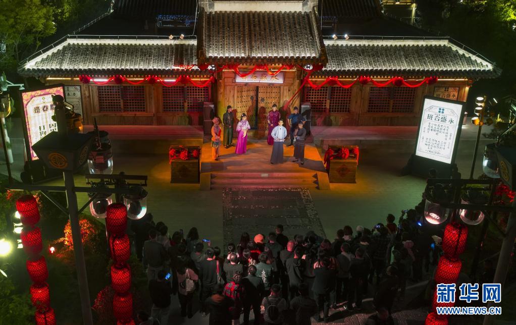 5月3日,演员在唐山市南湖景区为游客表演沉浸式体验剧《那年芳华》(无人机照片)。