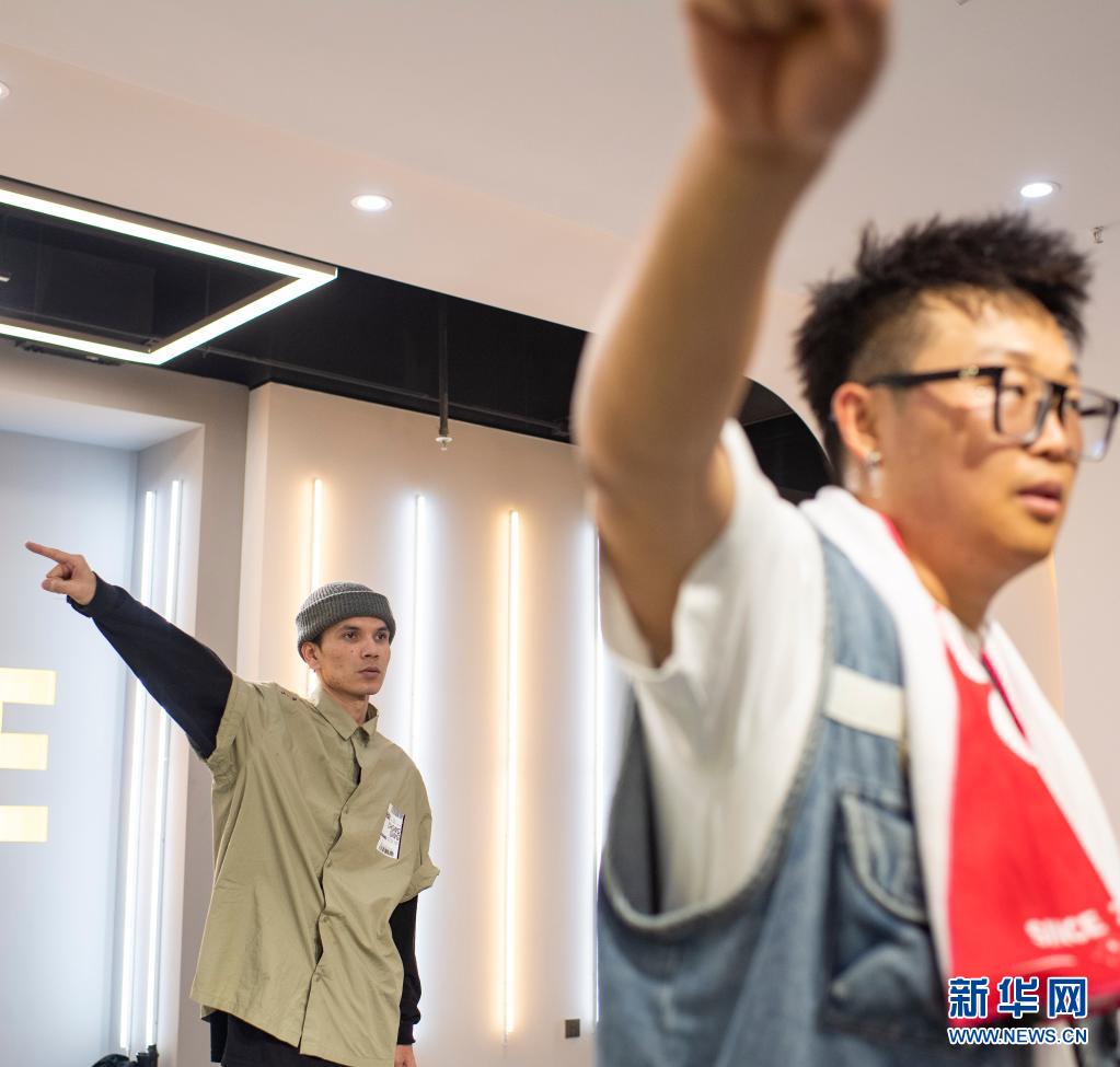 西热里·阿不都克然木与团队老师一起在负责人王卫国(右)带领下练习新的舞蹈技巧(4月21日摄)。新华社记者 胡虎虎 摄