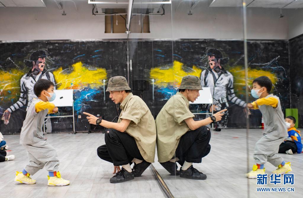 西热里·阿不都克然木考核街舞启蒙班的小朋友当天所学习的新动作(4月18日摄)。新华社记者 胡虎虎 摄