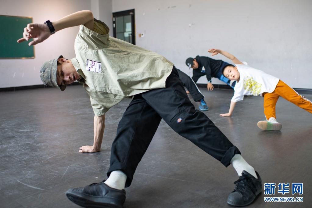 西热里·阿不都克然木带着周末街舞兴趣班的赵一宸(右,白色短袖)等小朋友练习街舞技巧(4月17日摄)。新华社记者 胡虎虎 摄