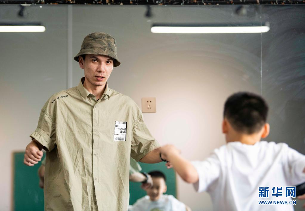 西热里·阿不都克然木带着周末街舞兴趣班的小朋友们练习街舞技巧(4月17日摄)。新华社记者 胡虎虎 摄
