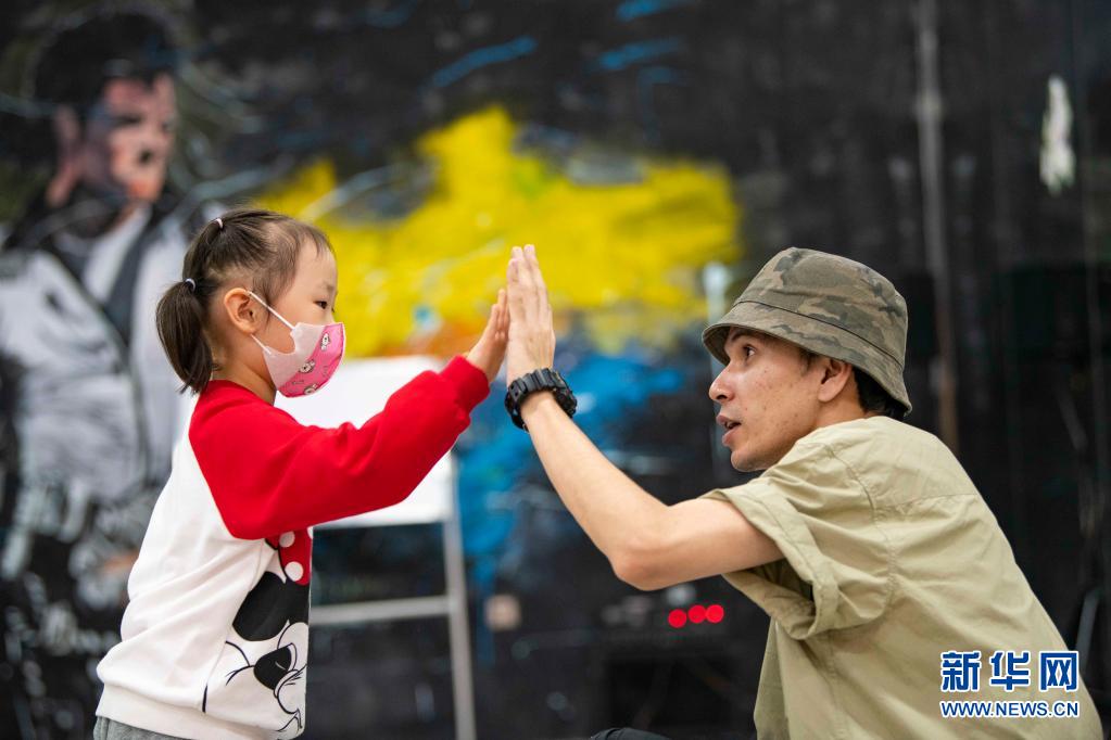 西热里·阿不都克然木上课时与小朋友击掌互动(4月18日摄)。新华社记者 胡虎虎 摄