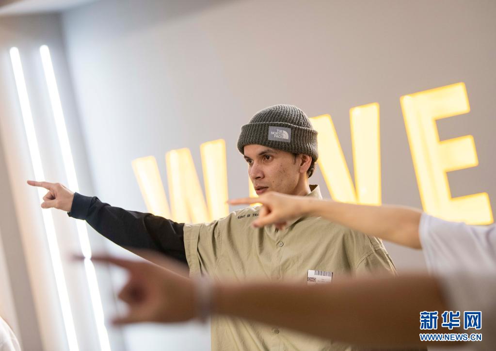 西热里·阿不都克然木与团队老师进行每周舞蹈技巧团训(4月21日摄)。新华社记者 胡虎虎 摄