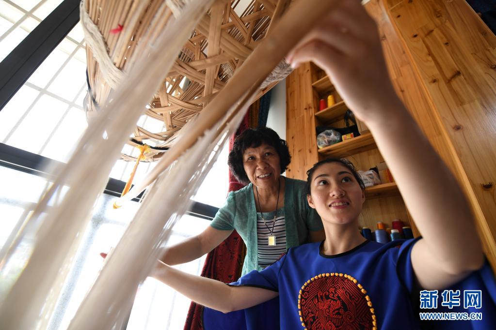 范丽华(右)在中国工艺美术大师谭湘光指导下,使用传统织锦机织壮锦(2018年5月17日摄)。