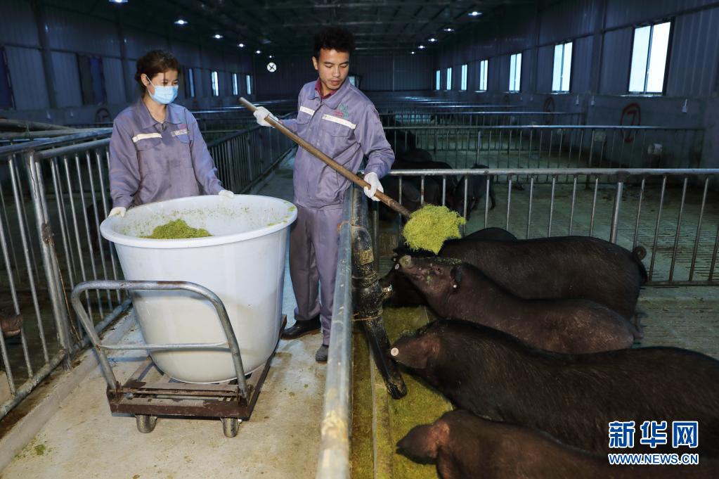 在广西德保县东凌乡定坡村,兰吉来(右)与女友陈紫辉在喂猪(2020年10月8日)。