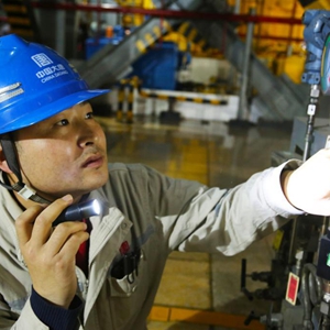 林显超在内蒙古大唐国际托克托发电有限责任公司车间内检查设备(2021年3月15日摄)。