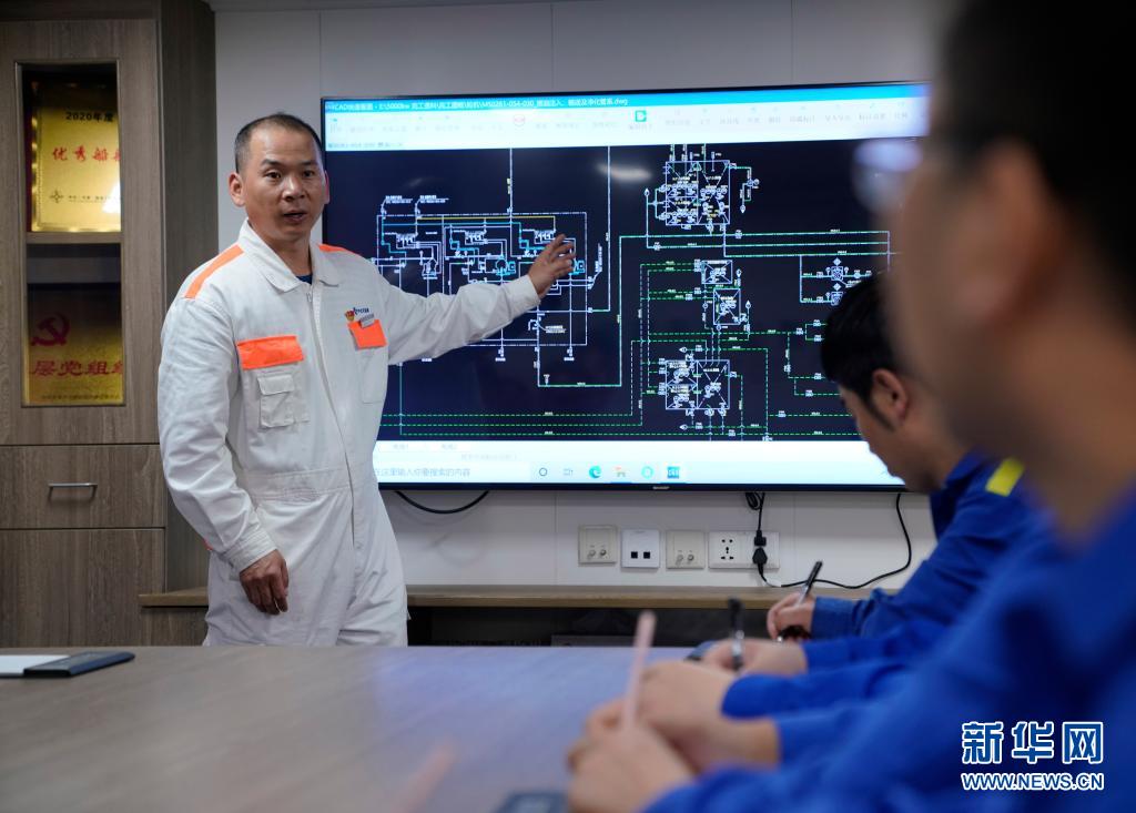 “天鲲号”轮机长王东(左一)为班组同事授课(2021年4月29日摄)。