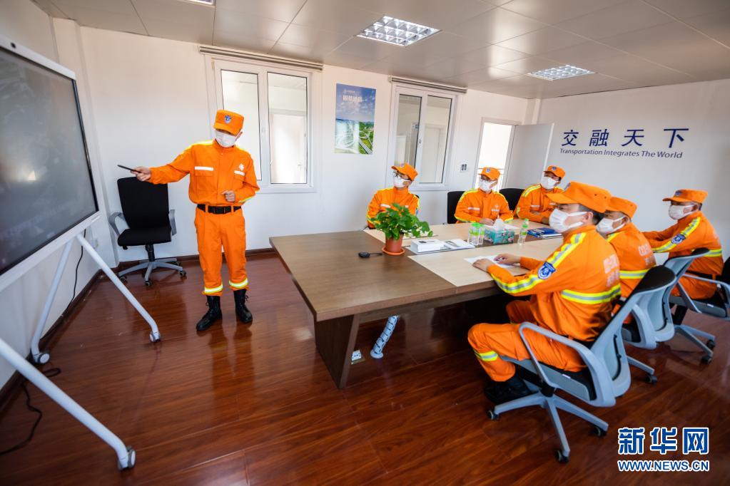 在中国交通建设集团有限公司(中国交建)马来西亚东海岸铁路项目总经理部关丹分址,项目应急救援队的队员们观看救援视频(4月10日摄)。