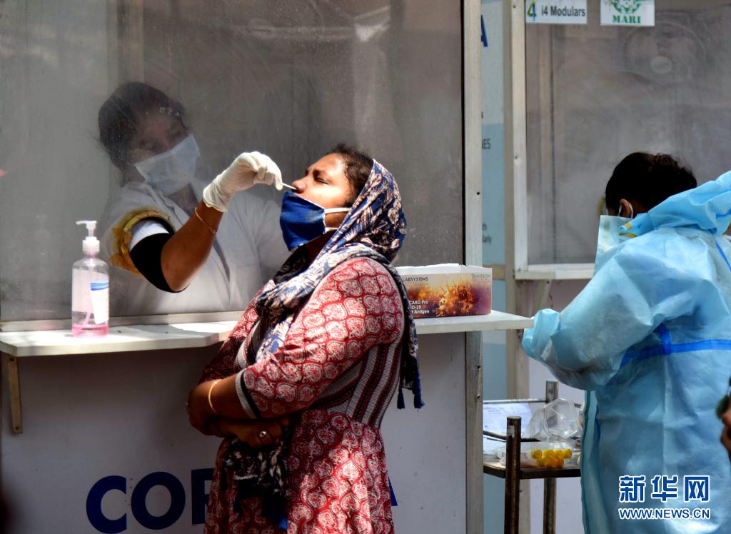 5月3日,一名女子在印度海得拉巴接受新冠病毒检测取样。