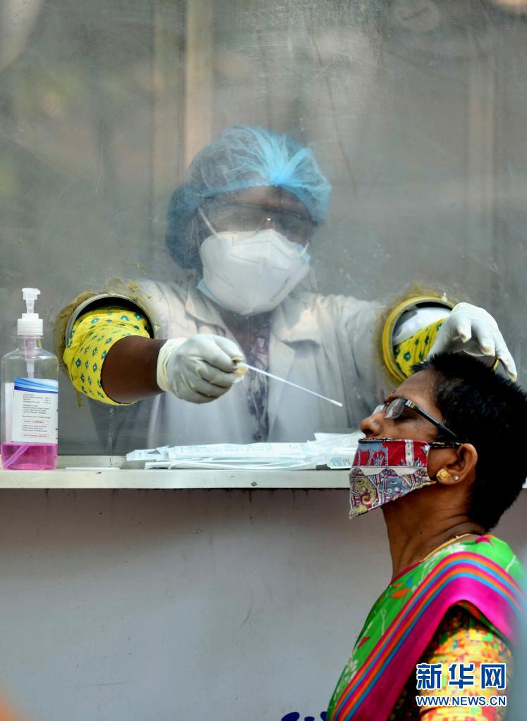 5月3日,一名女子在印度海得拉巴接受新冠病毒检测取样。