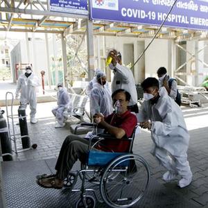 5月3日,医务人员在印度艾哈迈达巴德的医院内帮助新冠患者。