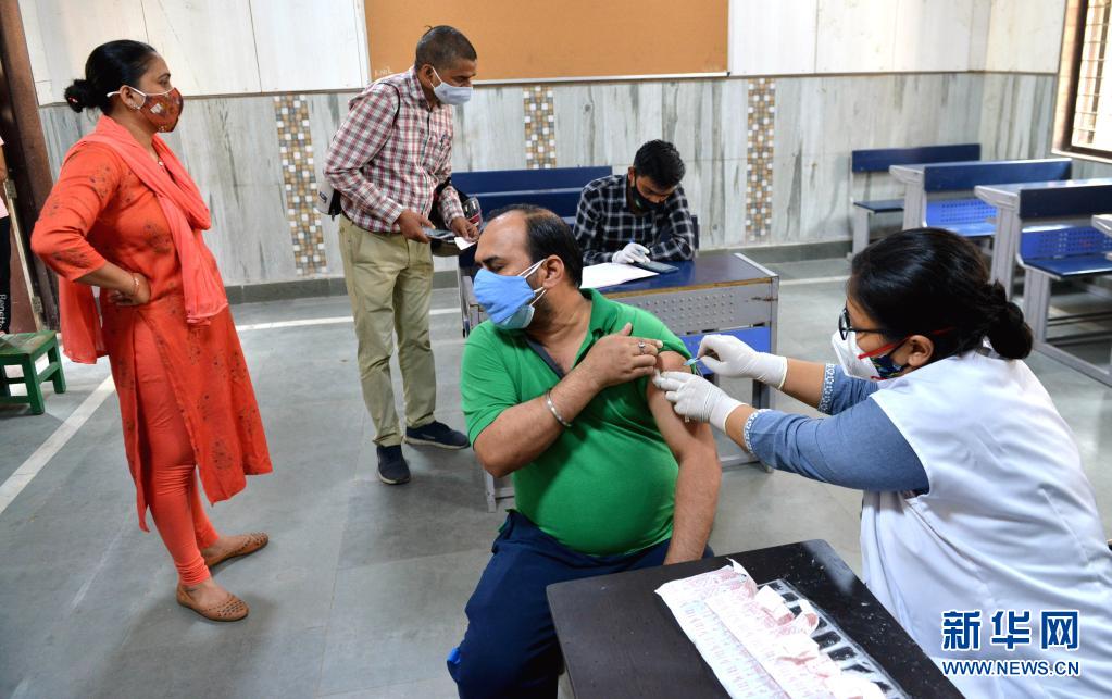 5月3日,医务人员在印度德里为一名男子注射新冠疫苗。